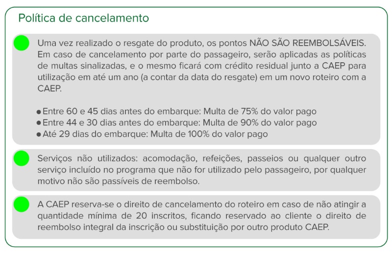 Prazo limite para resgate dos pontos até 30/05/2026 obs: em caso da não realização desta viagem, os pontos resgatados não serão devolvidos e o crédito fica entre CAEP e participante.