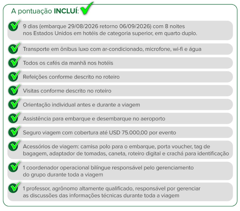 O roteiro desta viagem inclui: -Visitas técnicas e educativas: Universidades (Iowa State), centros de pesquisa agrícola e propriedades rurais e grãos, com palestras exclusivas sobre agricultura americana e commodities;